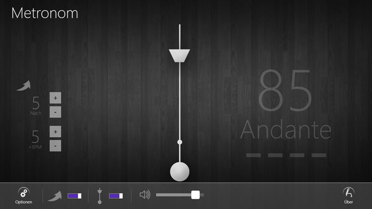 Diese App ist, was jeder Musiker benötigt. Ein Metronom. Sie können das Tempo (Schläge pro Minute) ändern und eine der vordefinierten Taktarten auswählen. Sie können außerdem die Takte und Betonungen so anpassen, wie Sie es wünschen und verschiedene Sounds wählen.